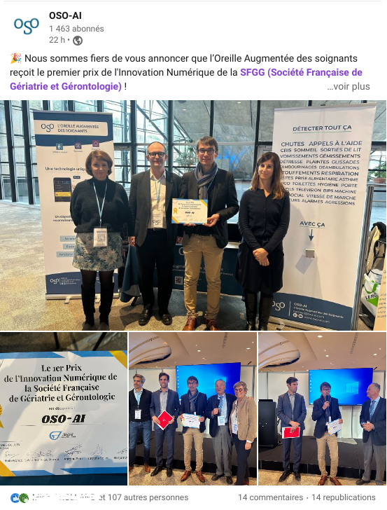 We are proud to announce that the Augmented Ear of caregivers receives the first prize for Digital Innovation from the French Society of Geriatrics and Gerontology!